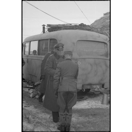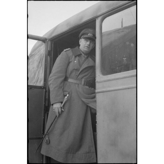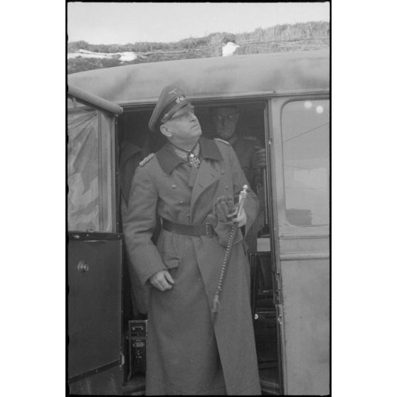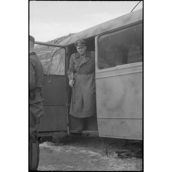 Le maréchal (Generalfeldmarchall) Ernst Buch quitte un bus dans lequel vient de se tenir une réunion d'état-major.