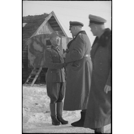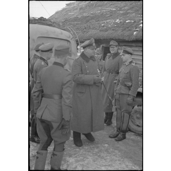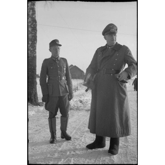 Le maréchal (Generalfeldmarchall) Buch en présence du général (Generalleutnant) Helmut Thumm (commandant de la 5. Jäger. Division).