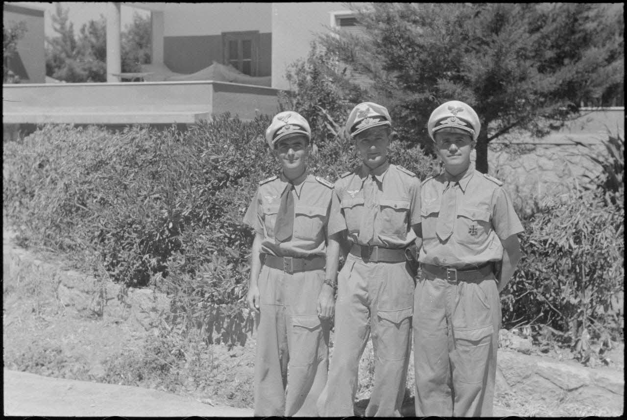 Le médecin (Stabartz) Dr. Sann, le capitaine (Hauptmann) Karvolat, le lieutenant (Oberleutnant) Glatz devant une villa réquisitionnée.