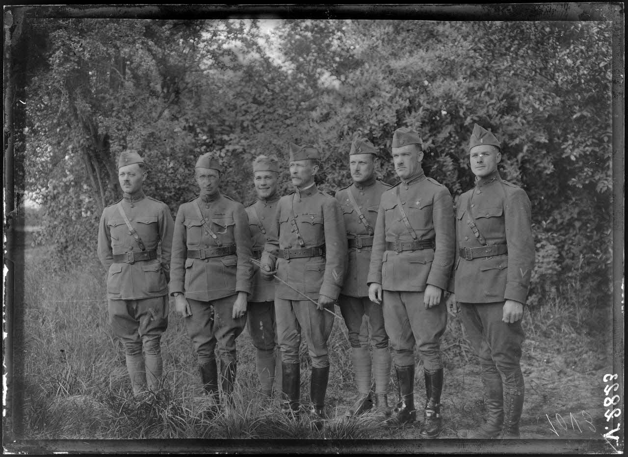 Rocquencourt, Oise, officiers et soldats du 1er bataillon du 2e régiment américain qui a fait l'attaque de Cantigny. De gauche à droite : A. Leblanc, capitaine C.R. Oliver, soldat William, soldat Edgar Thacker, capitaine C.R. Hucher, etc.