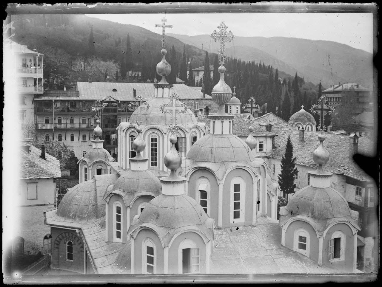 Une vue des coupoles du monastère Saint-Paul sur le mont Athos. Portraits de moines et de soldats.