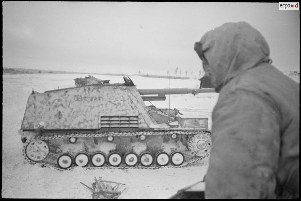 Un Nashorn (Sd.kfz.164) progresse sur une route enneigée. Un Sd.kfz.124 "Wespe" embourbé, a été abandonné par son équipage. Le passage d'un petit pont de bois demande le soutien de fantassins allemands, les camions l'empruntent également avec prudence. Des fantassins allemands progressent lentement sous la couverture des tirs des Nashorn baptisés "Ostpreussen" et "Goliath" (?). Le reporter est monté à bord d'un des canons automoteurs et immortalise les compartiments pour les obus de 8,8 cm pour le canon Pak 41/43 et quelques tirs. Après quelques salves, deux équipages se rassemblent pour fumer. Portraits de fantassins.