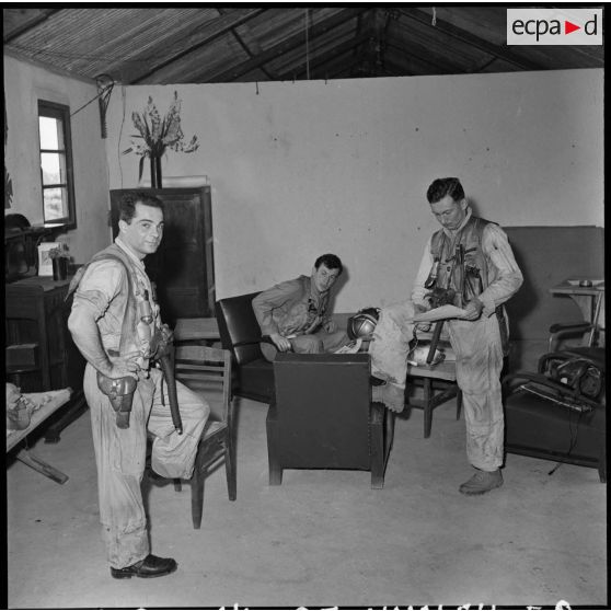 - celles de la 11F : réparations sur les appareils dans les hangars ; alignement des avions, ailes repliées ; briefing des pilotes par le lieutenant de Castelbajac, commandant la flottille, avant une mission à Diên Biên Phu.