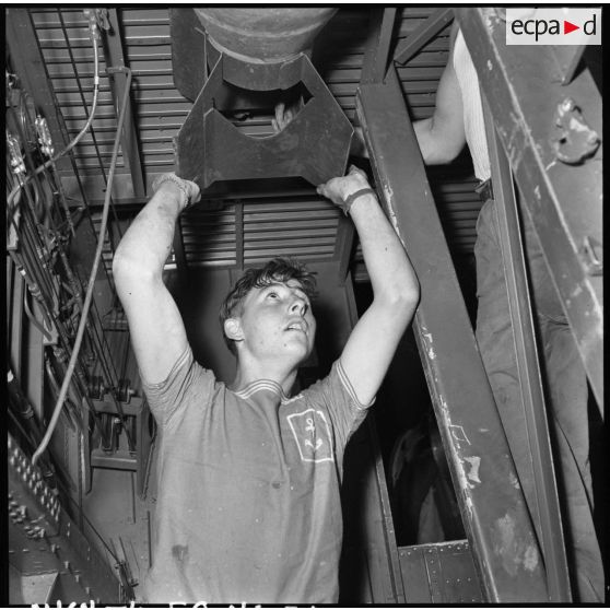 Un armurier de la l'aéronavale installe une bombe dans la soute d'un Privateer avant une mission sur Dien Bien Phu.