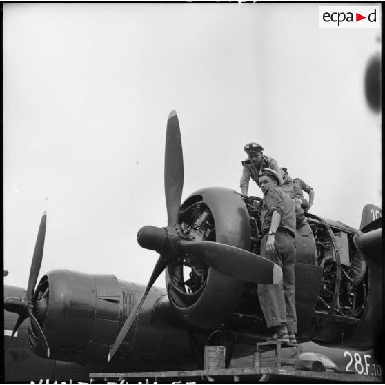Mécaniciens au travail sur un bombardier PB4Y-2 Privateer de la flotille 28F sur la base aérienne de Cat Bi.