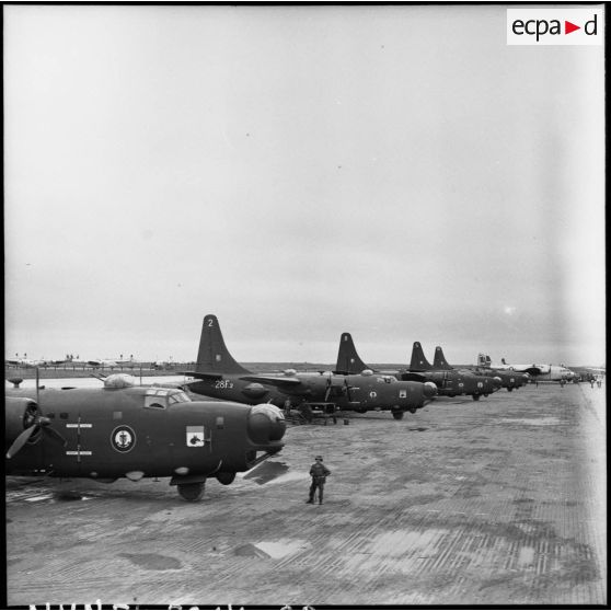 Alignement d'avions bombardiers PB4Y-2 Privateers de la flotille 28F sur le terrain de Cat Bi.