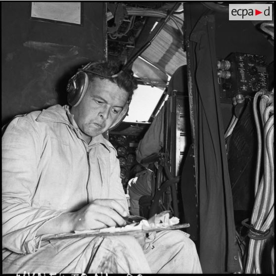 Le navigateur d'un bombardier PB4Y-2 Privateer de la flotille 28F effectue des réglages devant une carte lors d'une mission sur Diên biên Phu