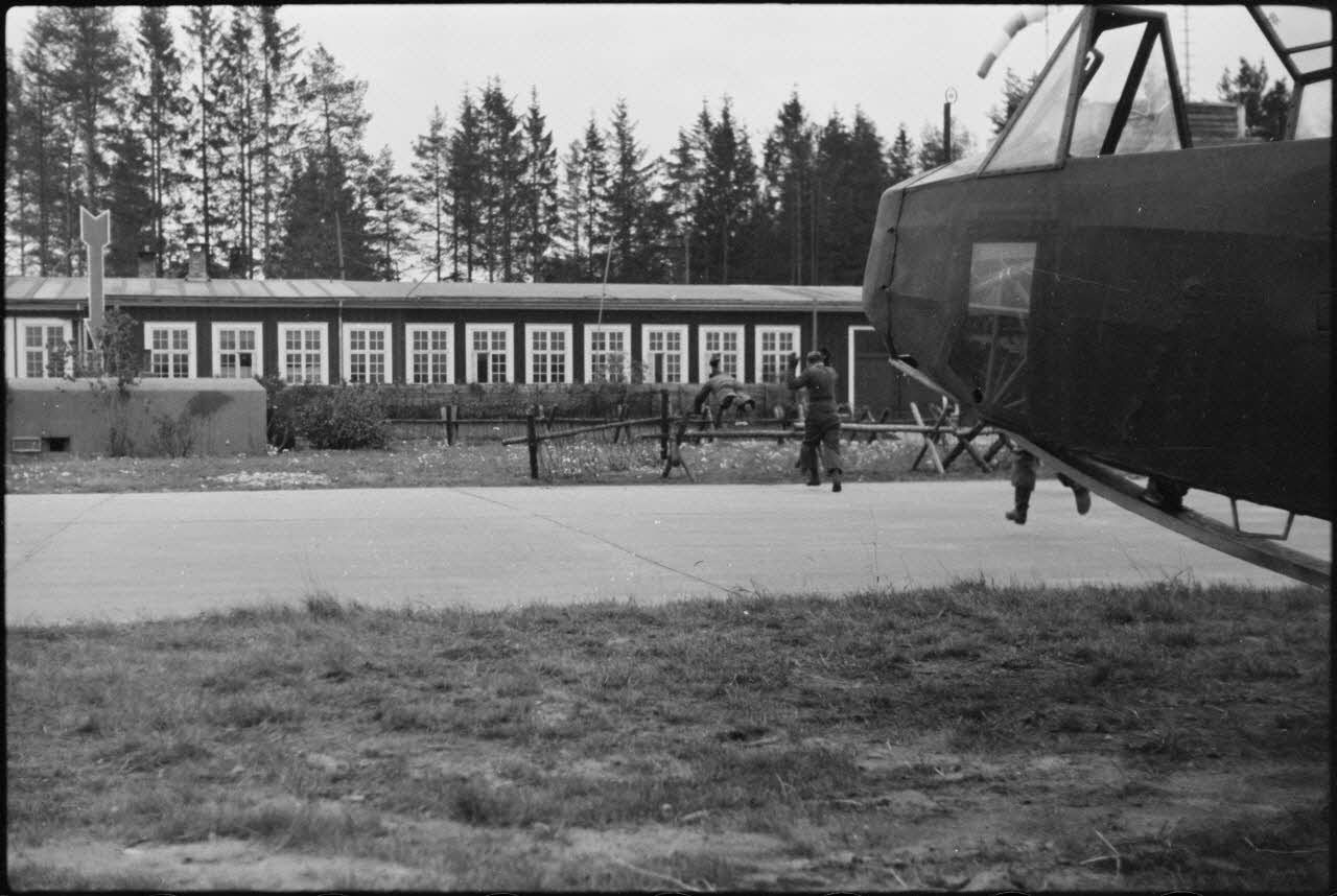 Pour les besoins de l'exercice, des fantassins de la Luftwaffe se postent autour de la piste dans des trous individuels. Une équipe de parachutistes s'équipe (casque, fumigènes, mitrailleuse MG-15 avec chargeurs).