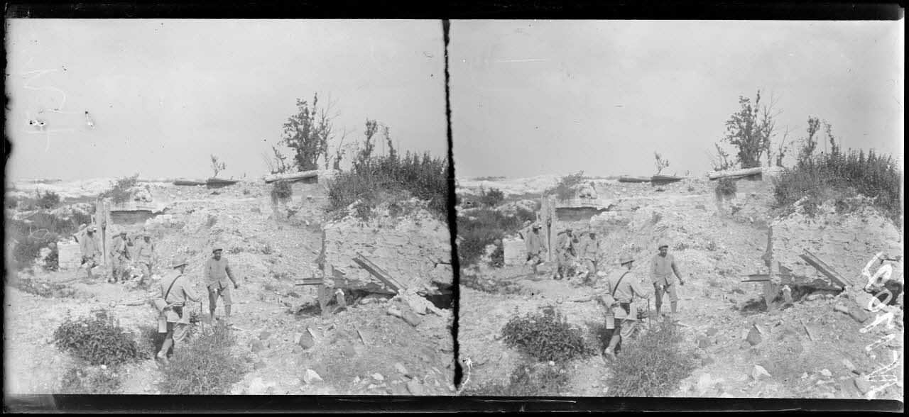 - Dans le secteur de La Harazée, les soldats se reposent entre deux gardes dans les abris construits à flanc de coteau. Au camp Condé, les hommes prennent la soupe. Du fil de fer barbelé est déchargé de camions pour être acheminé vers les réseaux. Un guetteur est installé dans son poste d'observation. Le commandant de la compagnie interroge le chef de section sur l'activité du jour. Dans les tranchées inondées par les pluies, les soldats évacuent l'eau avec une pompe. Des postes d'artillerie de tranchée sont installés à côté des postes d'observation. Des grenadiers voltigeurs du 296e RI (régiment d'infanterie) nettoient leurs armes, notamment le tromblon lance-grenades Vivien Bessières.