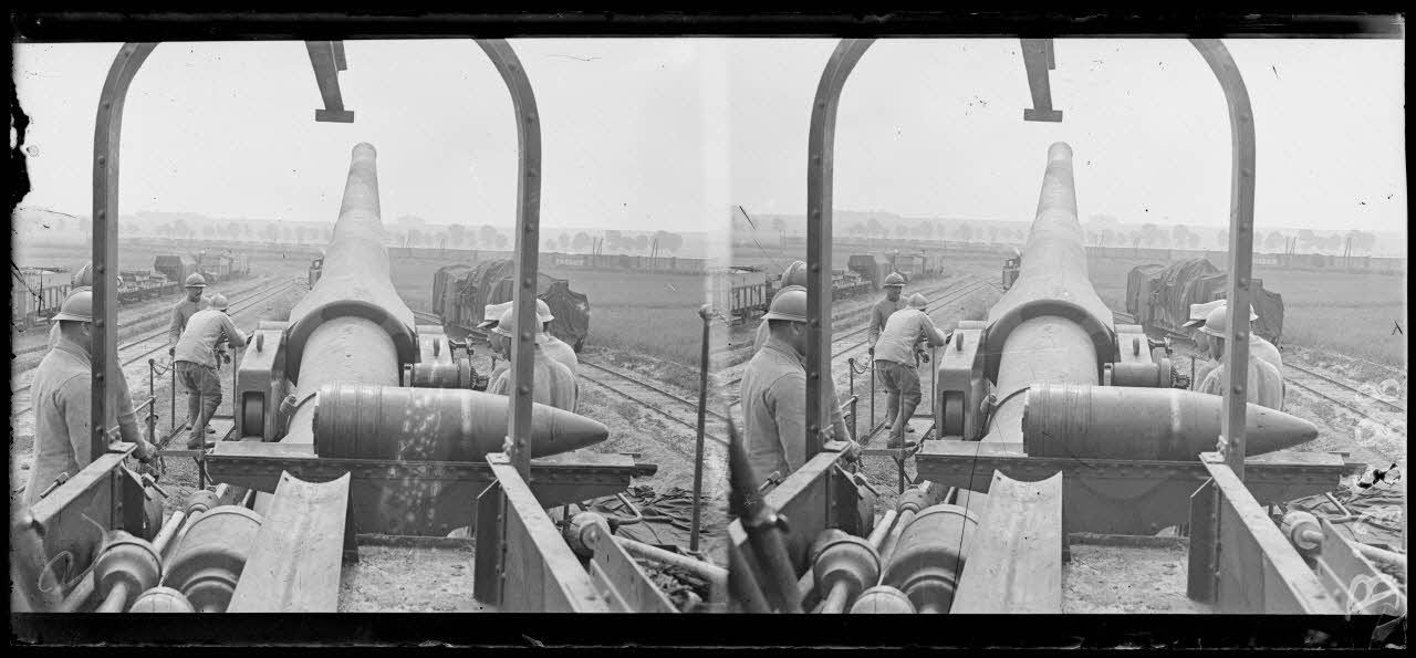 Le Petit-Blangy. Gare de ravitaillement en munitions de grosse artillerie. Canon de 305 mm sur voie ferrée. Le chargement.