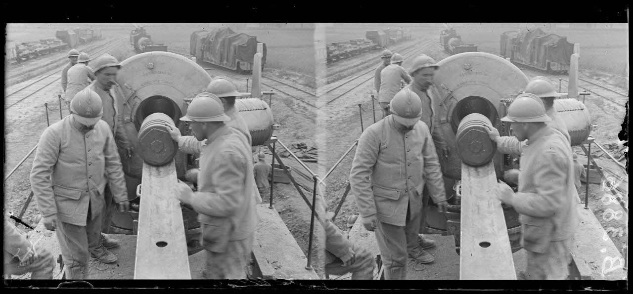 Le Petit-Blangy. Gare de ravitaillement en munitions de grosse artillerie. Canon de 305 mm sur voie ferrée. Le chargement.