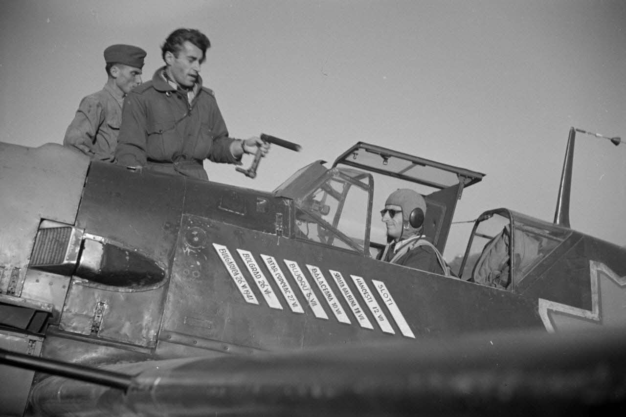 Le capitaine Dan Scurtu aux commandes d'un chasseur allemand Messerchmitt Bf-109 E