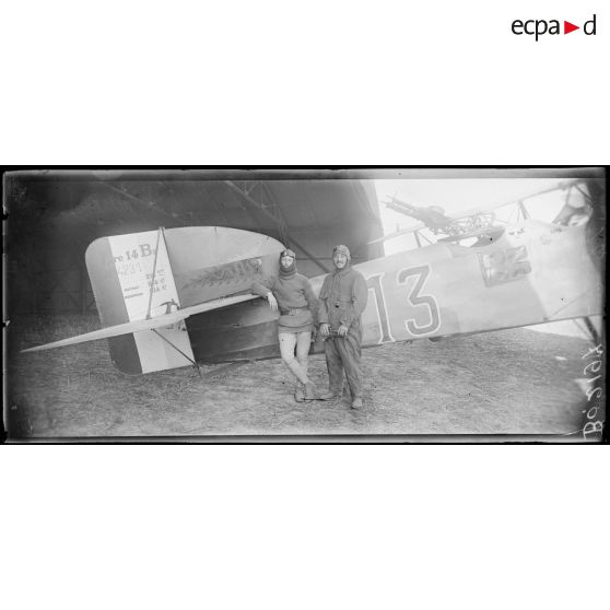 Roissy-en-France (Seine-et-Oise), camp d'aviation. L'adjudant Leclerc, 60 bombardements, 1 avion, et l'adjudant Marseilles, 97 bombardements. GB3 - BR107.