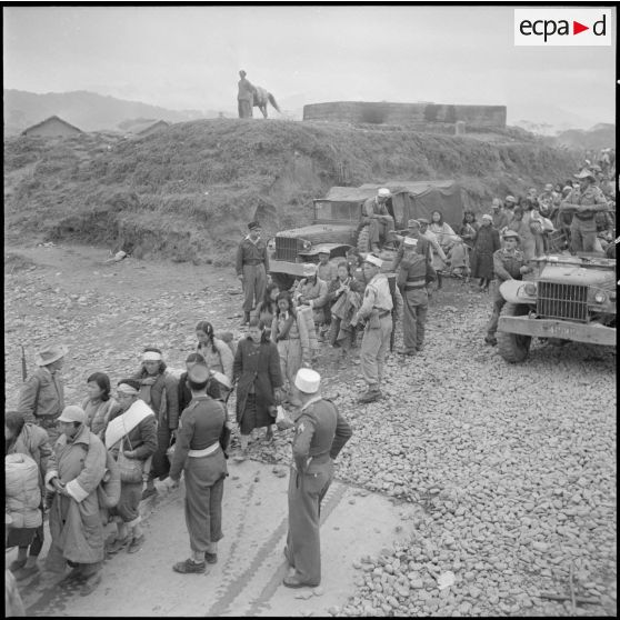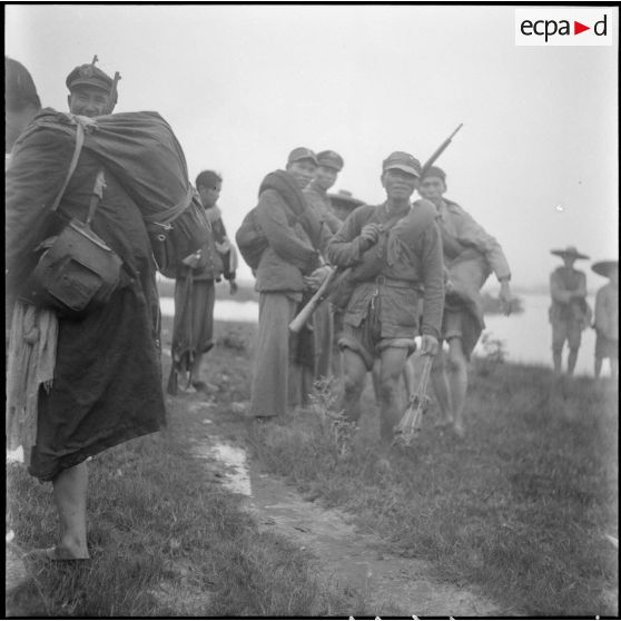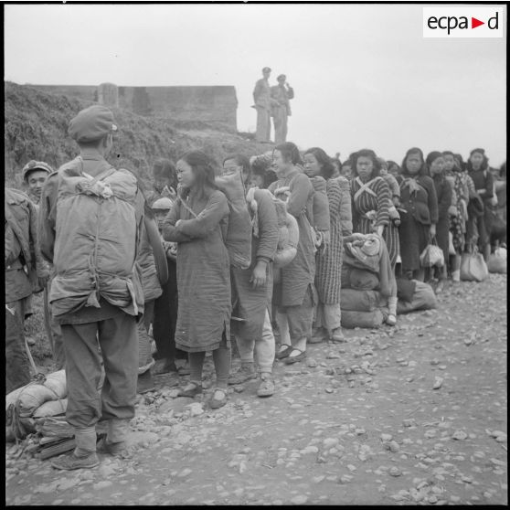 Des soldats nationalistes chinois et leur famille attendent de passer sur le bac de Tien Yen, sous la garde de la Légion étrangère.