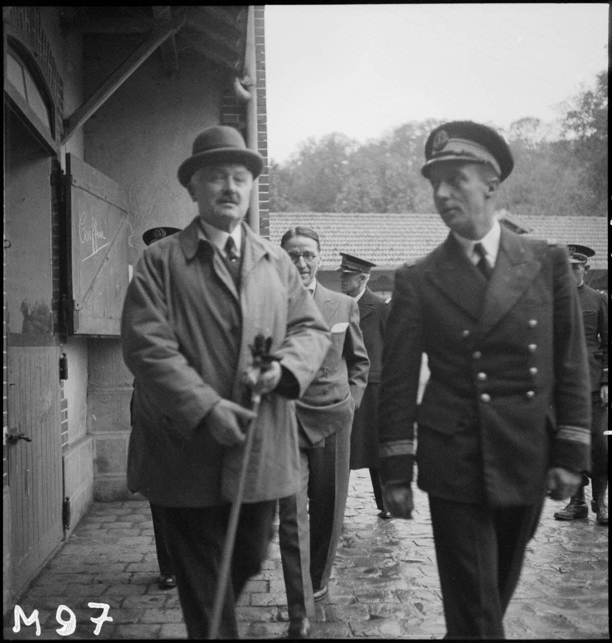 Le président de la République, Albert Lebrun, accompagné du ministre de la Marine, César Campinchi, et du chef d'état-major de la Marine, l'amiral de la flotte François Darlan, visite un camp d'entraînement de fusiliers marins sous la conduite du capitaine de corvette commandant le camp.