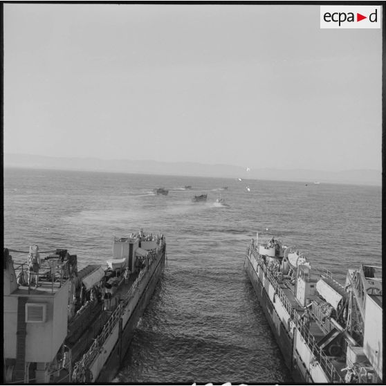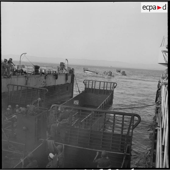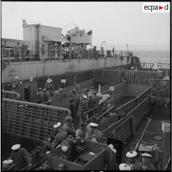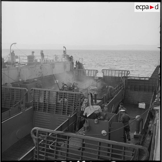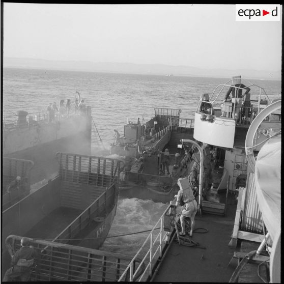 A bord de la Foudre, les premiers LCM (landing craft material) sortent en mer les uns après les autres.