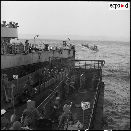 Exercices de débarquement à bord du bateau porte engins d'assaut Foudre.