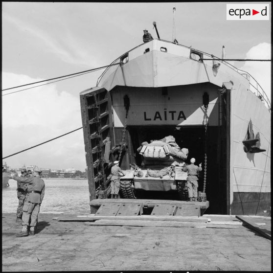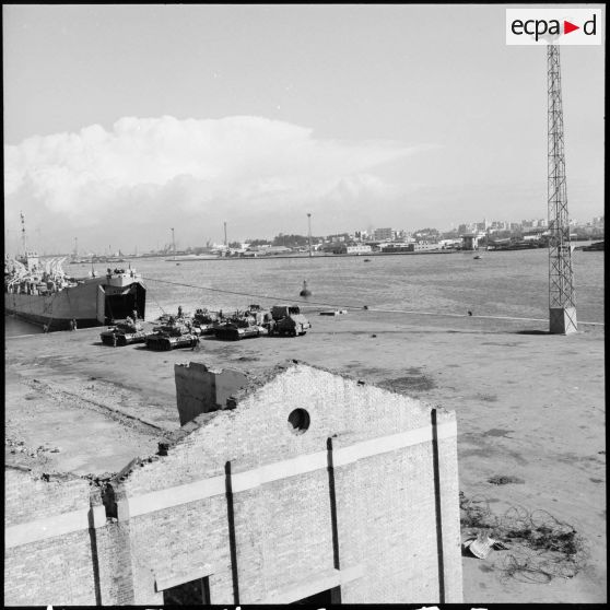 Le rembarquement des half-tracks M3 et des chars Patton du 8e RD à Port-Saïd.