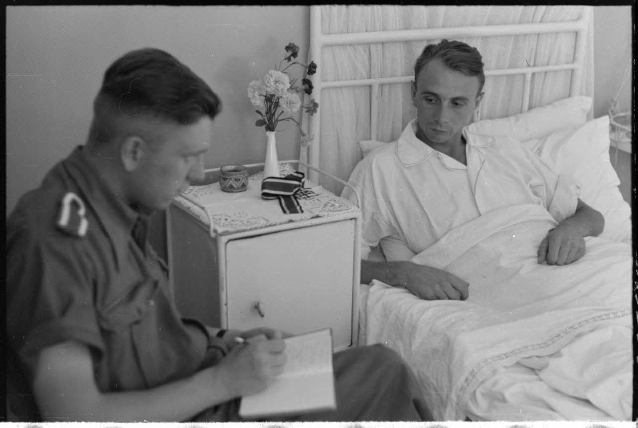 Dans un hôpital militaire, portrait de Josef Wenigmann du Sturzkampfgeschwader 3 (I-StG-3) récipiendaire de la croix de chevalier de la croix de fer (Ritterkreuz).