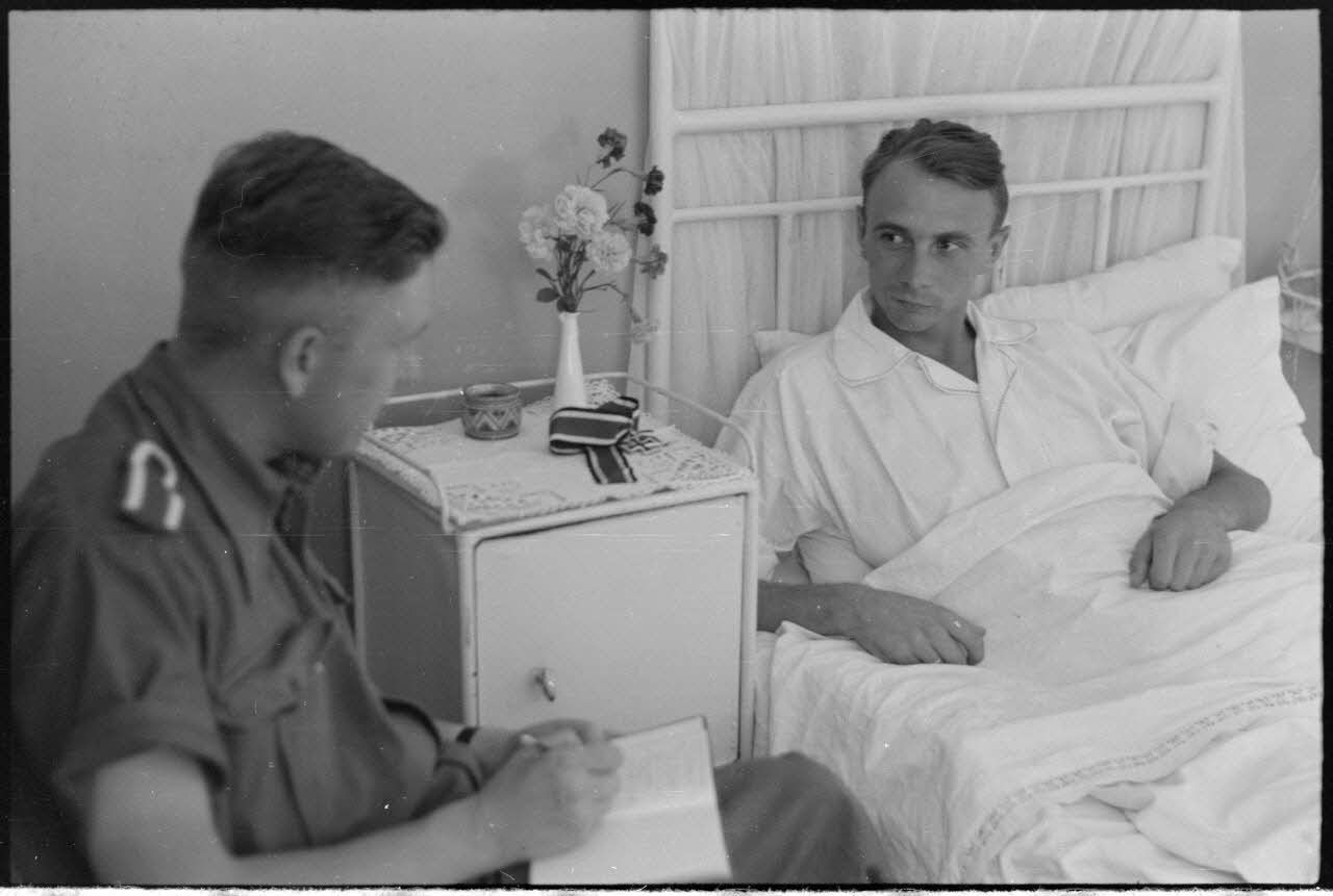 Dans un hôpital militaire, portrait de Josef Wenigmann du Sturzkampfgeschwader 3 (I-StG-3) récipiendaire de la croix de chevalier de la croix de fer (Ritterkreuz).