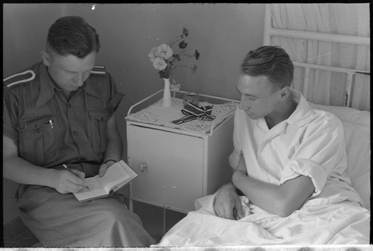 Dans un hôpital militaire, portrait de Josef Wenigmann du Sturzkampfgeschwader 3 (I-StG-3) récipiendaire de la croix de chevalier de la croix de fer (Ritterkreuz).