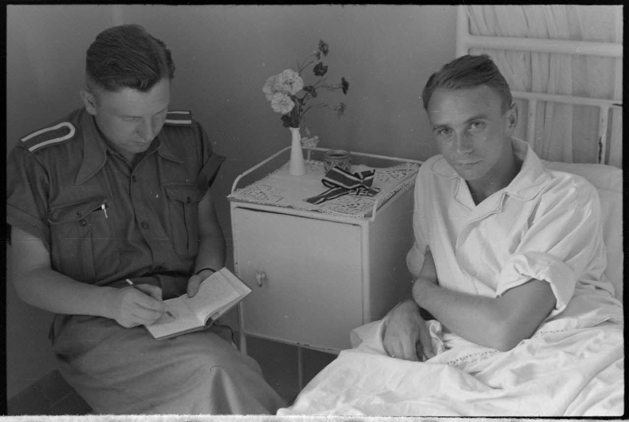 Dans un hôpital militaire, portrait de Josef Wenigmann du Sturzkampfgeschwader 3 (I-StG-3) récipiendaire de la croix de chevalier de la croix de fer (Ritterkreuz).