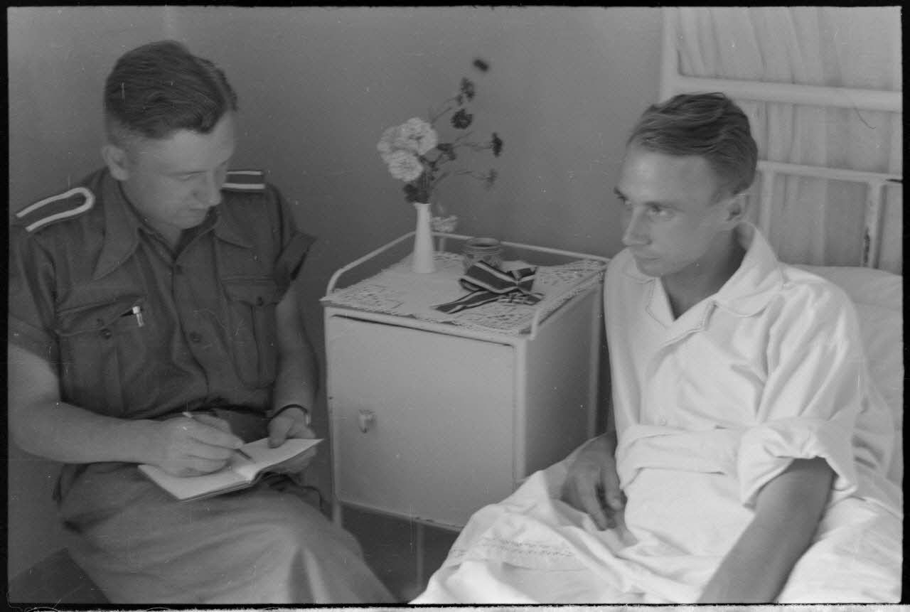 Dans un hôpital militaire, portrait de Josef Wenigmann du Sturzkampfgeschwader 3 (I-StG-3) récipiendaire de la croix de chevalier de la croix de fer (Ritterkreuz).