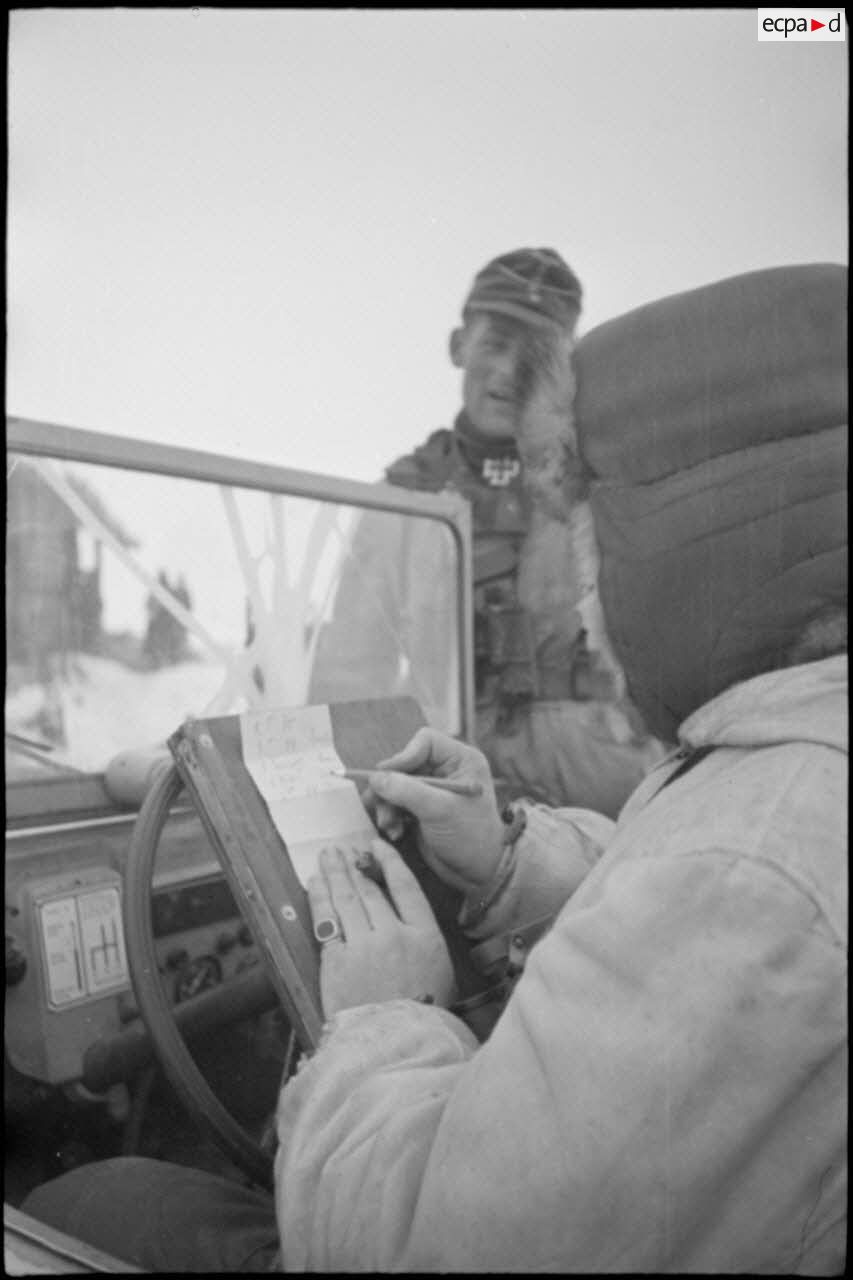 Le capitaine pose en compagnie de ses hommes (consulter le reportage Pk697 film 969 pour retrouver des portraits du capitaine). Le reporter est à bord d'une voiture amphibie " Schimmwagen " et photographie le lieutenant Albert Ernst.