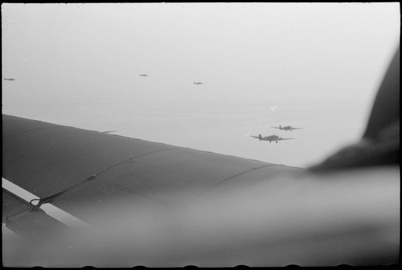 Le reporter Robert Schiffmann illustre le vol de transfert vers la Sicile à bord d'un avion de transport Junkers Ju-52.