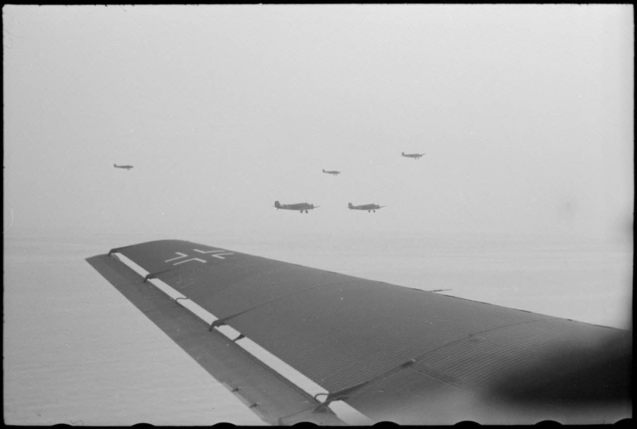 Le reporter Robert Schiffmann illustre le vol de transfert vers la Sicile à bord d'un avion de transport Junkers Ju-52.