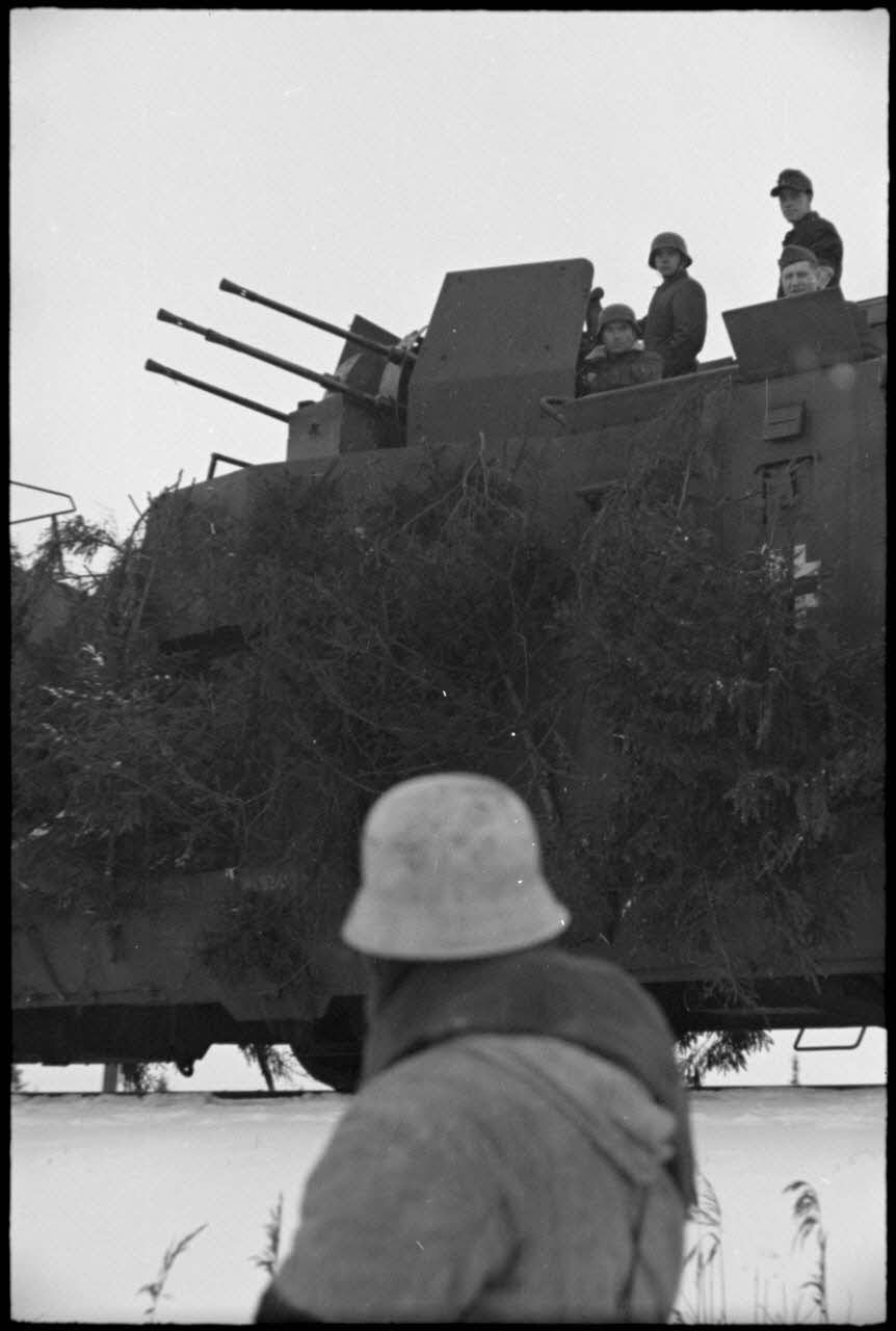 Le retour d'une patrouille de Jäger allemands vers un train blindé, les tubes quadruples du 2 cm Flakvierling dominent les structures du train allemand.