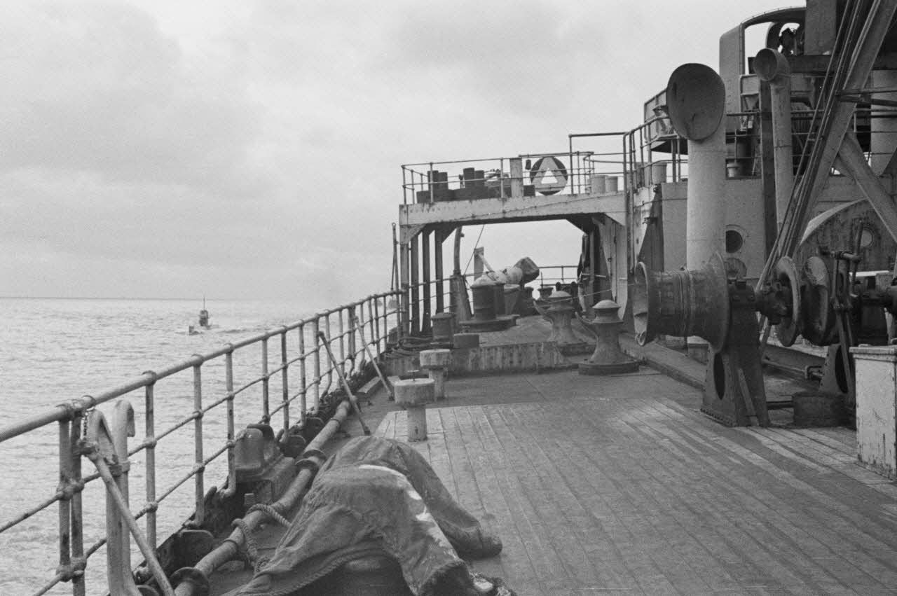 Le retour de croisière d'un sous-marin allemand photographié depuis le pont d'un dragueur de mines du type Sperrbrecher (briseur de blocus).