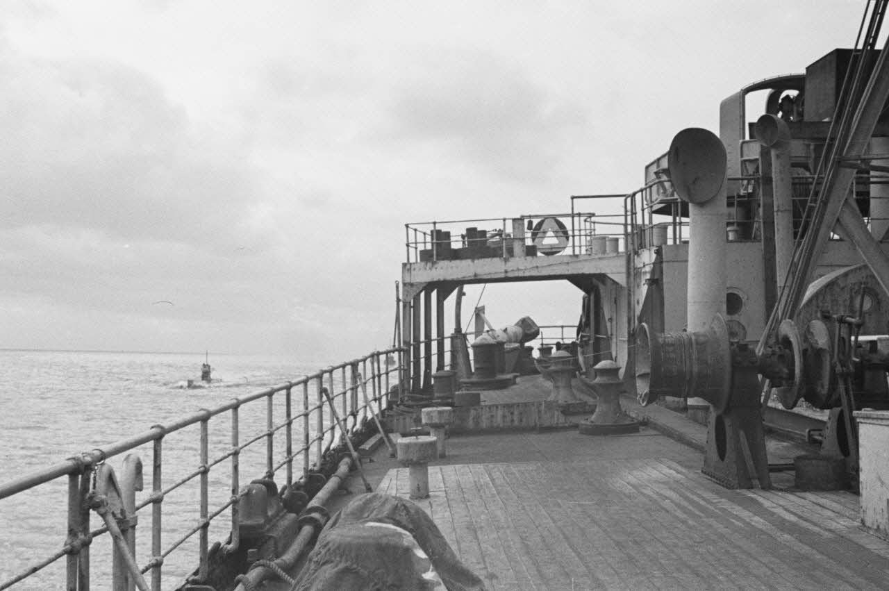 Le retour de croisière d'un sous-marin allemand photographié depuis le pont d'un dragueur de mines du type Sperrbrecher (briseur de blocus).