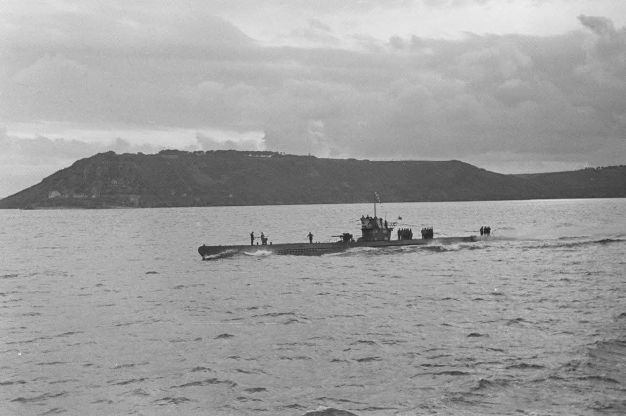 Le retour de croisière d'un sous-marin allemand photographié depuis le pont d'un dragueur de mines du type Sperrbrecher (briseur de blocus).