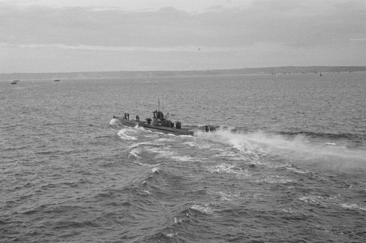 Le retour de croisière d'un sous-marin allemand photographié depuis le pont d'un dragueur de mines du type Sperrbrecher (briseur de blocus).