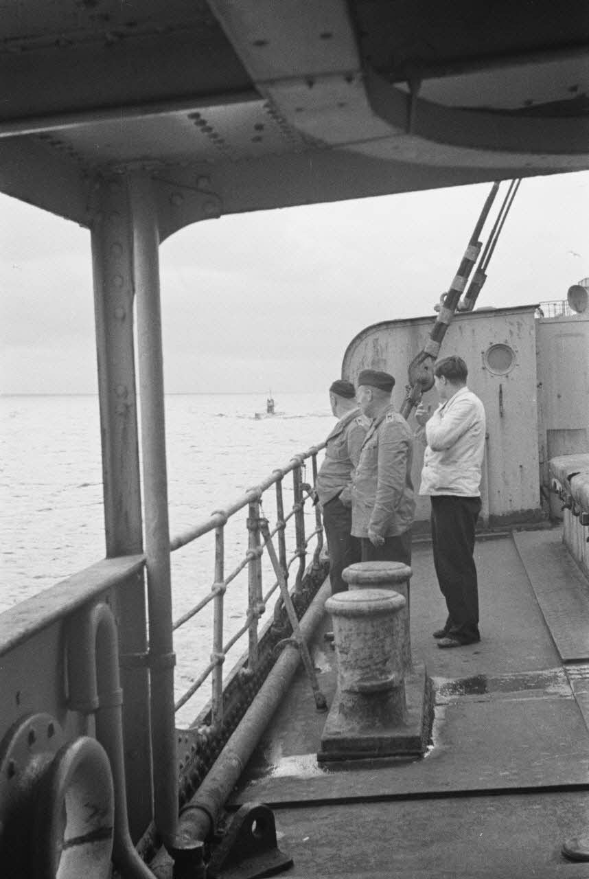 Le retour de croisière d'un sous-marin allemand photographié depuis le pont d'un dragueur de mines du type Sperrbrecher (briseur de blocus).