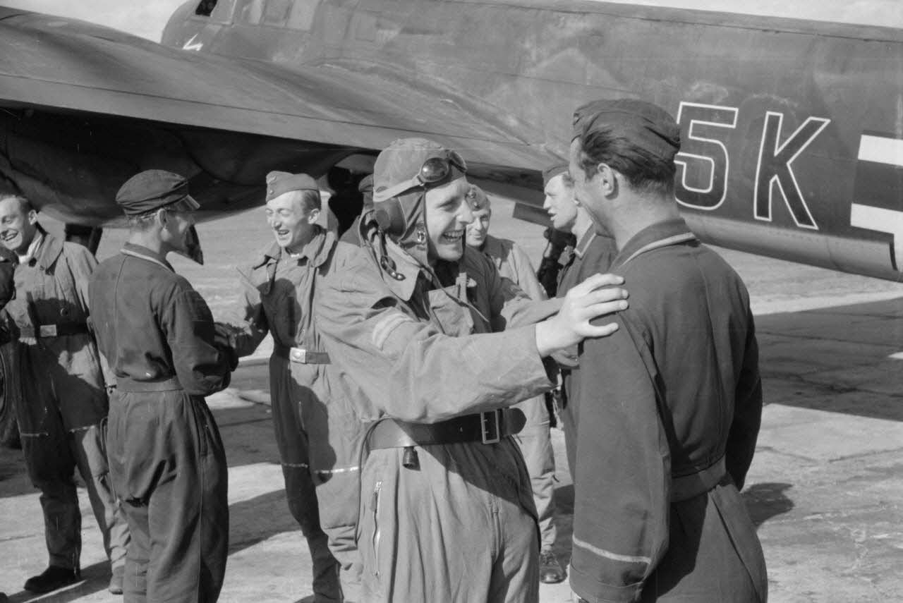 Le retour de mission d'un équipage de bombardier Junkers Ju-88 du Kampfgeschwader 3 Blitz, l'équipage est salué par les mécaniciens.