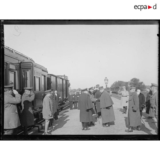 Le roi d'Angleterre à sa descente du wagon à Estré Saint Denis est reçu par le Président de la République et le général Joffre.