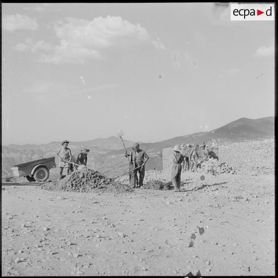 Deux soldats du 50e BG travaillent à la réfection d'un mur d'enceinte du fortin Caravansérail avec des Algériens.