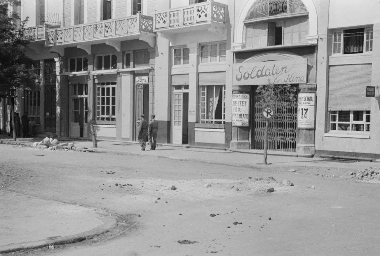 Paysage de la mer Egee (Ägäis). Le Soldaten Kino de la ville crétoise occupée, les actualités hebdomadaires y sont présentées. On remarque sur le mur du cinéma l'annonce du numéro 17 des actualiés hebdomadaires (Nr.17), qui pourait correspondre au "Die Deutsche Wochenschau 606/17/1942" daté du 15.04.1942. A proximité du cinéma, un coiffeur réservé aux forces d'occupation (Friseur Salon) et l'hôtel baptisé "Kreta" (DAA 1986 L14).