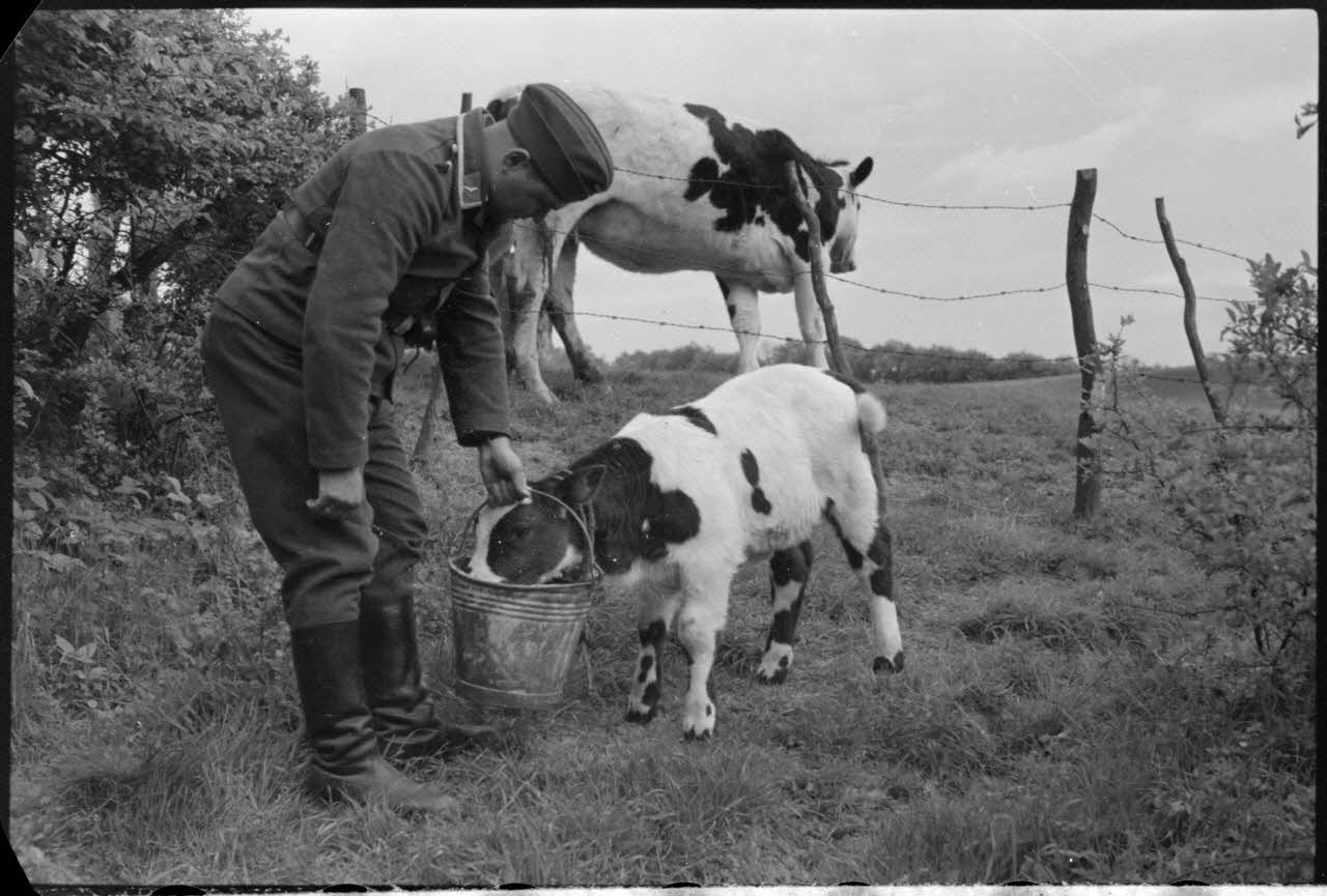 Dans le secteur de Harmor (Belgique), un chauffeur de la 4e compagnie de propagande de l'armée de l'air s'intéresse au lait d'une vache.