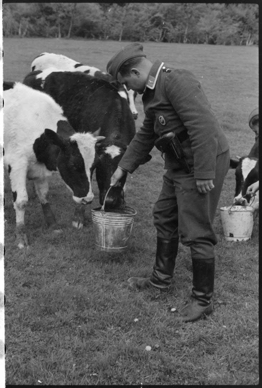Traite d'une vache par des membres de la même compagnie de propagande, on reconnaît notamment le caméraman Hans Theyer. Le reporter porte le grade de Sonderführer (G pour Gruppenführer), grade équivalent à sous-officier. Convois allemands sur une route de Belgique.
