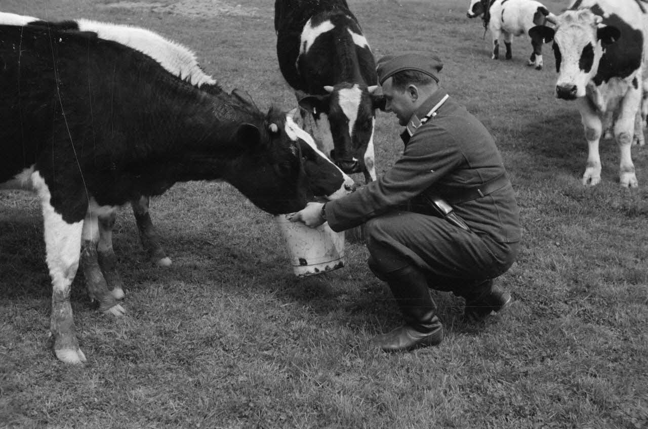 Dans le secteur de Harmor (Belgique), un chauffeur de la 4e compagnie de propagande de l'armée de l'air s'intéresse au lait d'une vache.