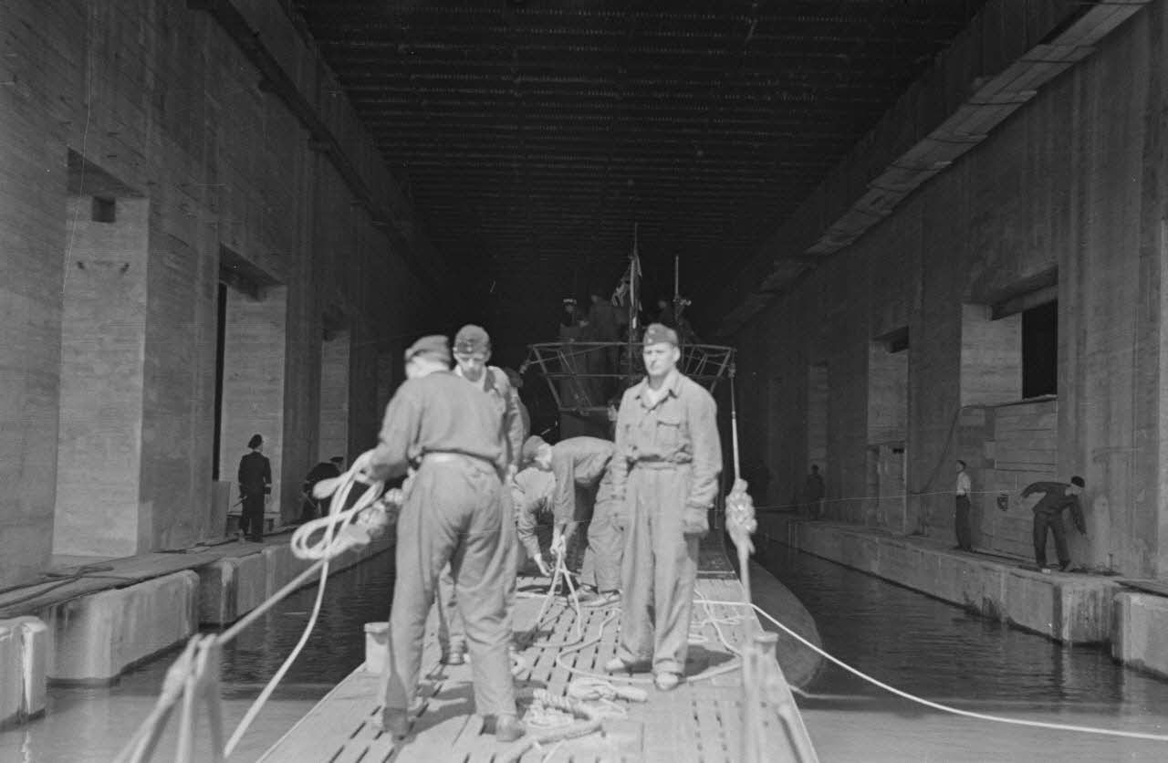A Saint-Nazaire, les premières manoeuvres du sous-marin U-boot U-203 pour rentrer dans la base sous-marine.