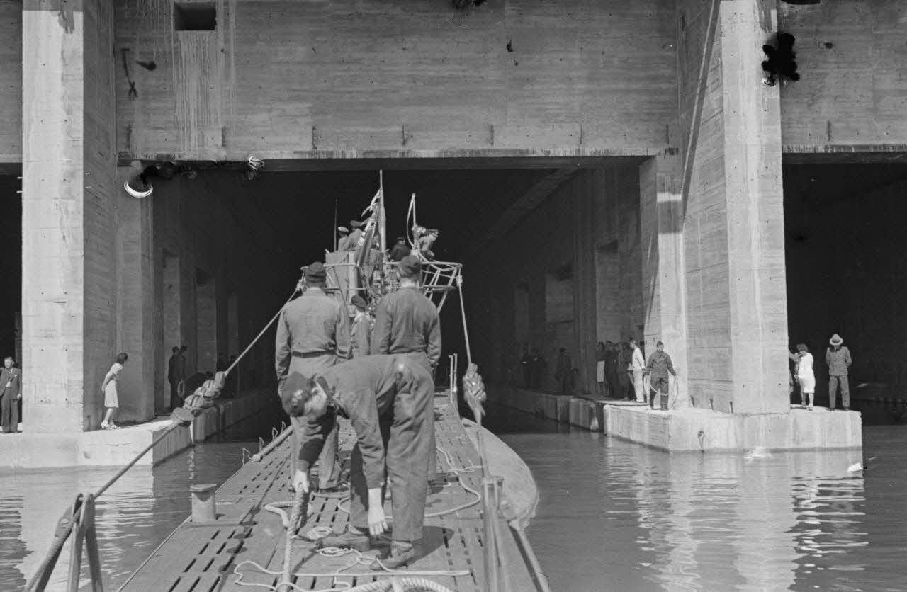 Le sous-marin allemand U-203 amorce son entrée dans une alvéole du port sous-marin de Saint-Nazaire.