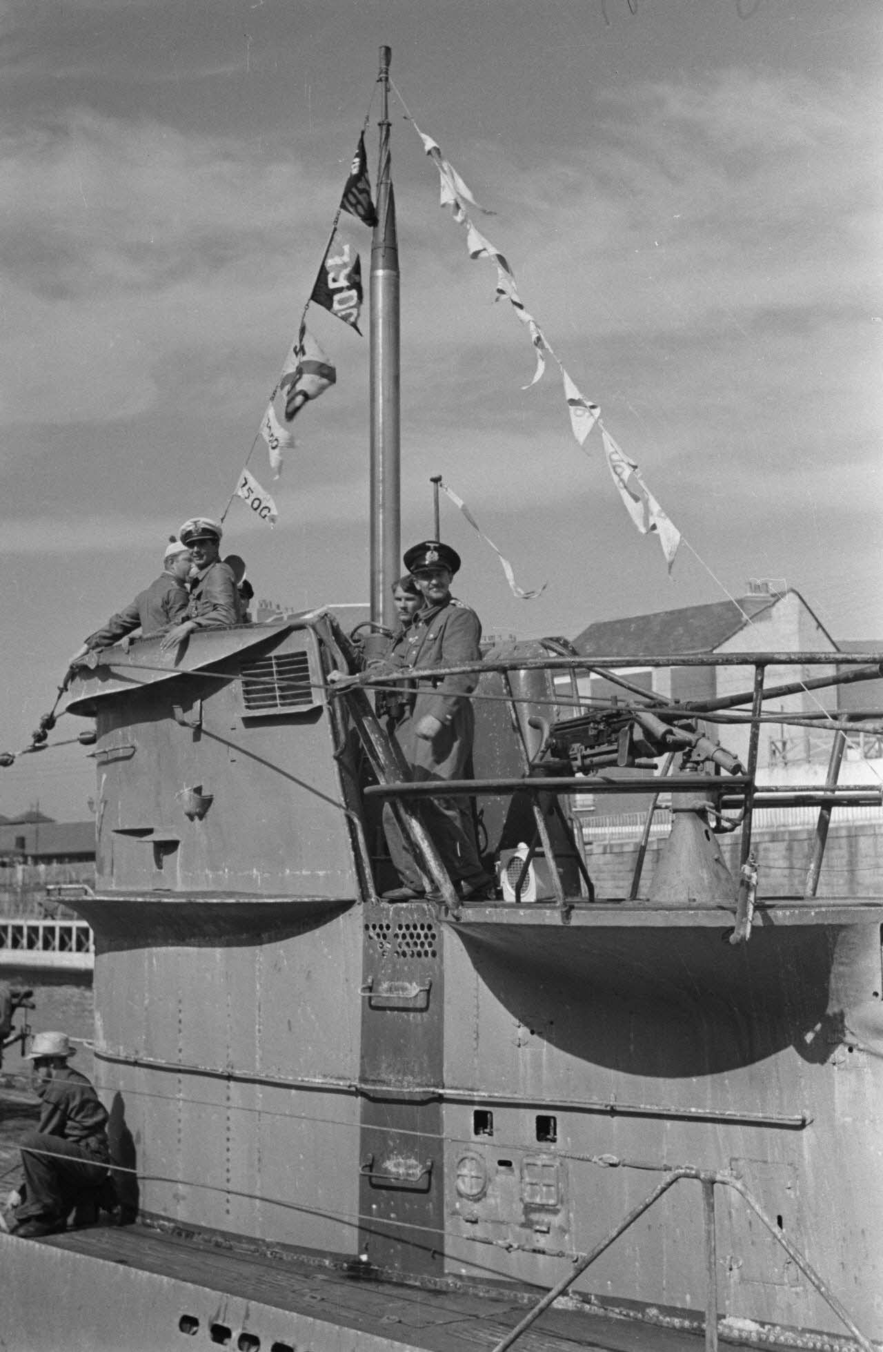 Des membres de l'équipage du sous-marin U-69 lors du retour du navire au port de Saint-Nazaire.