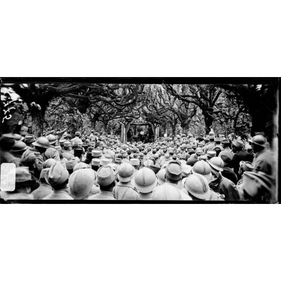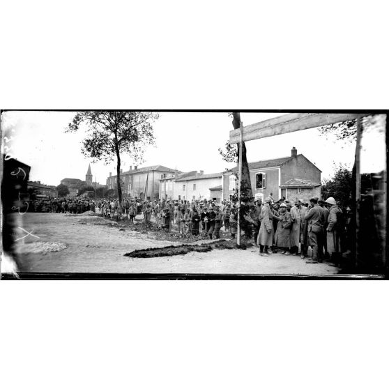 Dieulouard (Meurthe-et-Moselle). Le théâtre aux armées. Les soldats du Bois Le Prêtre viennent assister à la représentation.