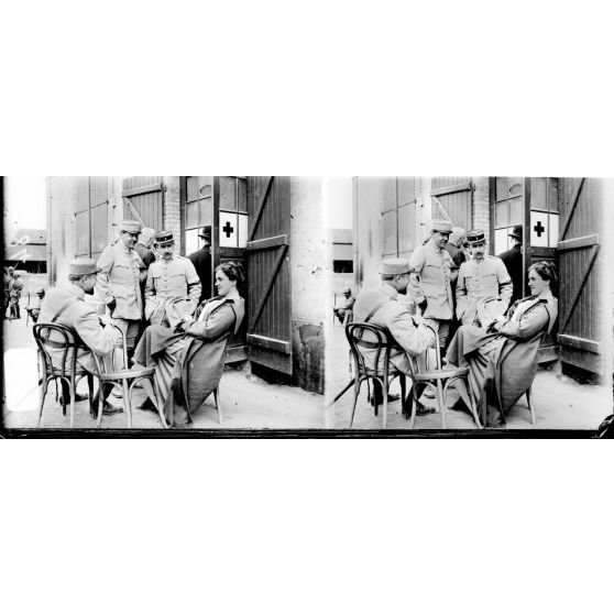 Sarah Bernhardt est le plus souvent photographiée entourée de soldats ou en compagnie d'artistes, Lucienne Breval, monsieur Duminy, madame Duluc, monsieur Fursy et mademoiselle Dussanne.