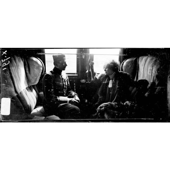 Le théâtre aux armées. Mme Sarah Bernhardt et Mme Lucienne Breval en wagon. [légende d'origine]
