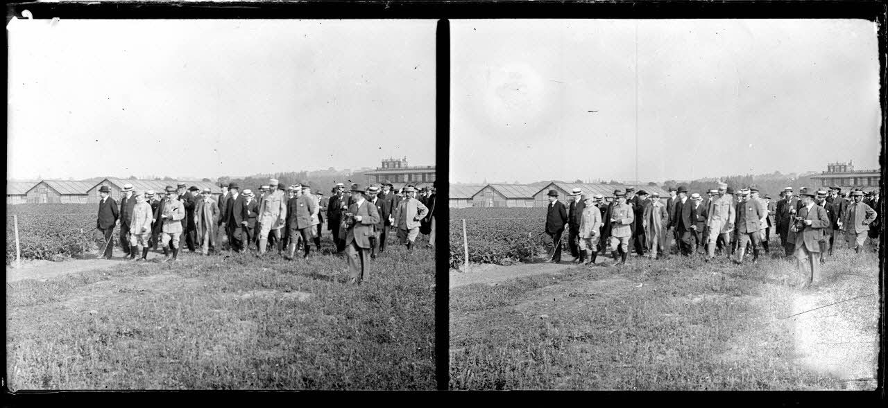 Le Tremblay (Seine et Oise). M. David, ministre de l'agriculture. Le capitaine Morin, directeur de culture des troupes disponibles visitent le champ de culture.